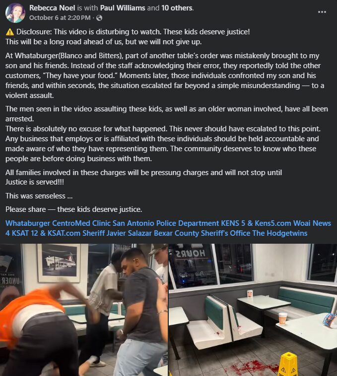 A woman named Rebecca Noel, who identified herself as the mother of one of the individuals involved, posted on Facebook that the altercation began after a Whataburger staff member mistakenly gave her son’s group another customer’s food.