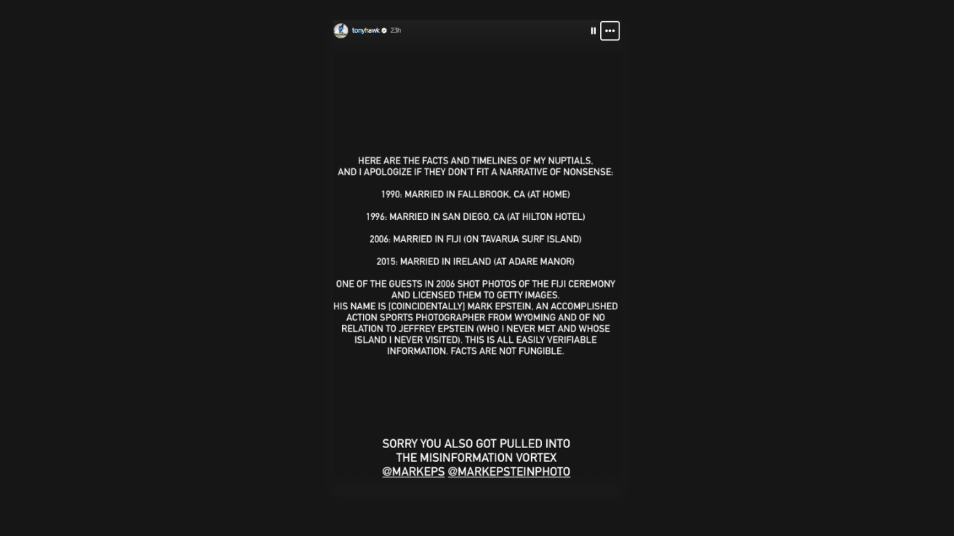 FBI report in the Epstein files states Tony Hawk got married on Epstein Island
